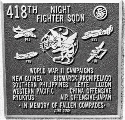 Herinneringsplaquette voor het 418th Night Fighter Squadron in de US Air Force Academy in Colorado Springs.