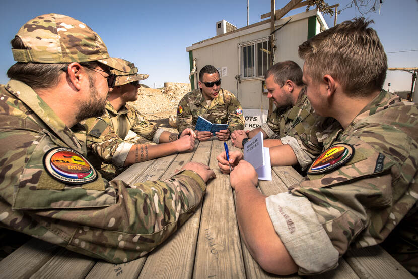 Transportcoördinator sergeant-majoor Dennis (op de foto in het midden) heeft 4 korporaals onder zich, allemaal opgeleid op vrijwel elk voertuig in het uitzendgebied. Logistiek gezien vindt hij een missie als deze ‘het mooiste wat er is’: “Tijdens redeployments komt er qua voorbereiding, planning en uitvoering heel veel op je af. Je bent in een korte periode heel erg druk.”