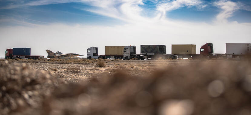 Op weg naar de haven passeert een colonne een rij buiten dienst gestelde Mirage F-1’en van de Jordaanse luchtmacht.