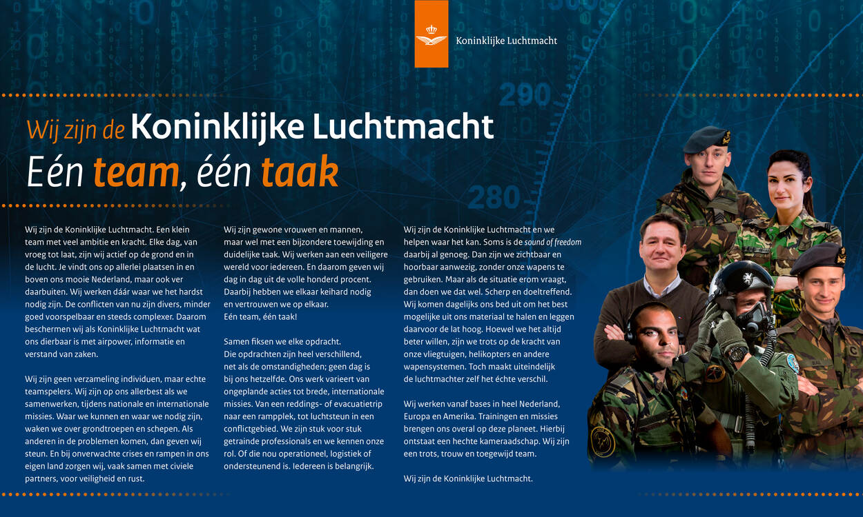 Kant-en-klaar liggen er presentaties, foto’s, filmpjes en infographics voor je klaar op een digitaal presenteerblaadje. Spullen die jóuw persoonlijke verhaal naar wie dan ook kunnen ondersteunen. Een basistekst staat er ook. Nee, geen propagandaverhaal van de luchtmachtleiding of hun woordvoerders. Juist niet. Maar één op basis van zo’n 65 verhalen van collega-luchtmachters: zij die het werk doen op de grond en in de lucht. In kleine groepjes spraken ze uitgebreid met elkaar over hun werk bij de luchtmacht, de positieve en negatieve kanten. Teamspirit en het gevoel samen het verschil te kunnen maken, voerden de boventoon naast wat – terecht – gemopper.