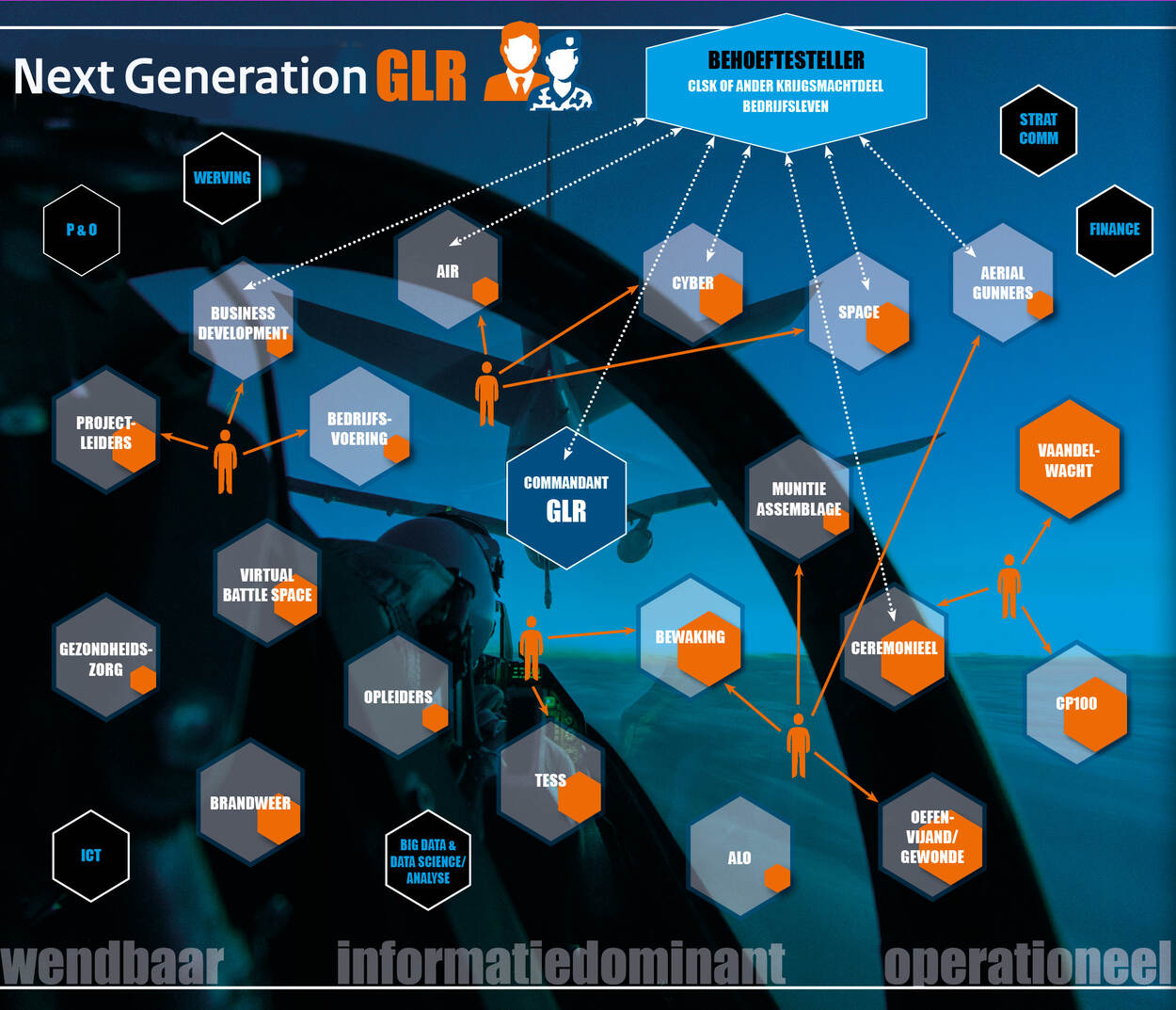 De GLR gaat werken volgens een netwerkstructuur. Alle specialisaties krijgen op termijn hun eigen ‘cel’. Deze manier van werken sluit goed aan bij de adaptieve krijgsmacht en de ideeën van de 5e generatie luchtmacht. Illustratie: KLu
