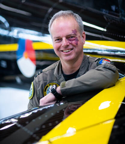 Foto onder: Kloosterman te midden van iedereen die binnen en buiten het squadron er voor hebben gezorgd dat het project succesvol werd afgerond. Job well done! Foto: sergeant-majoor Gerben van Es