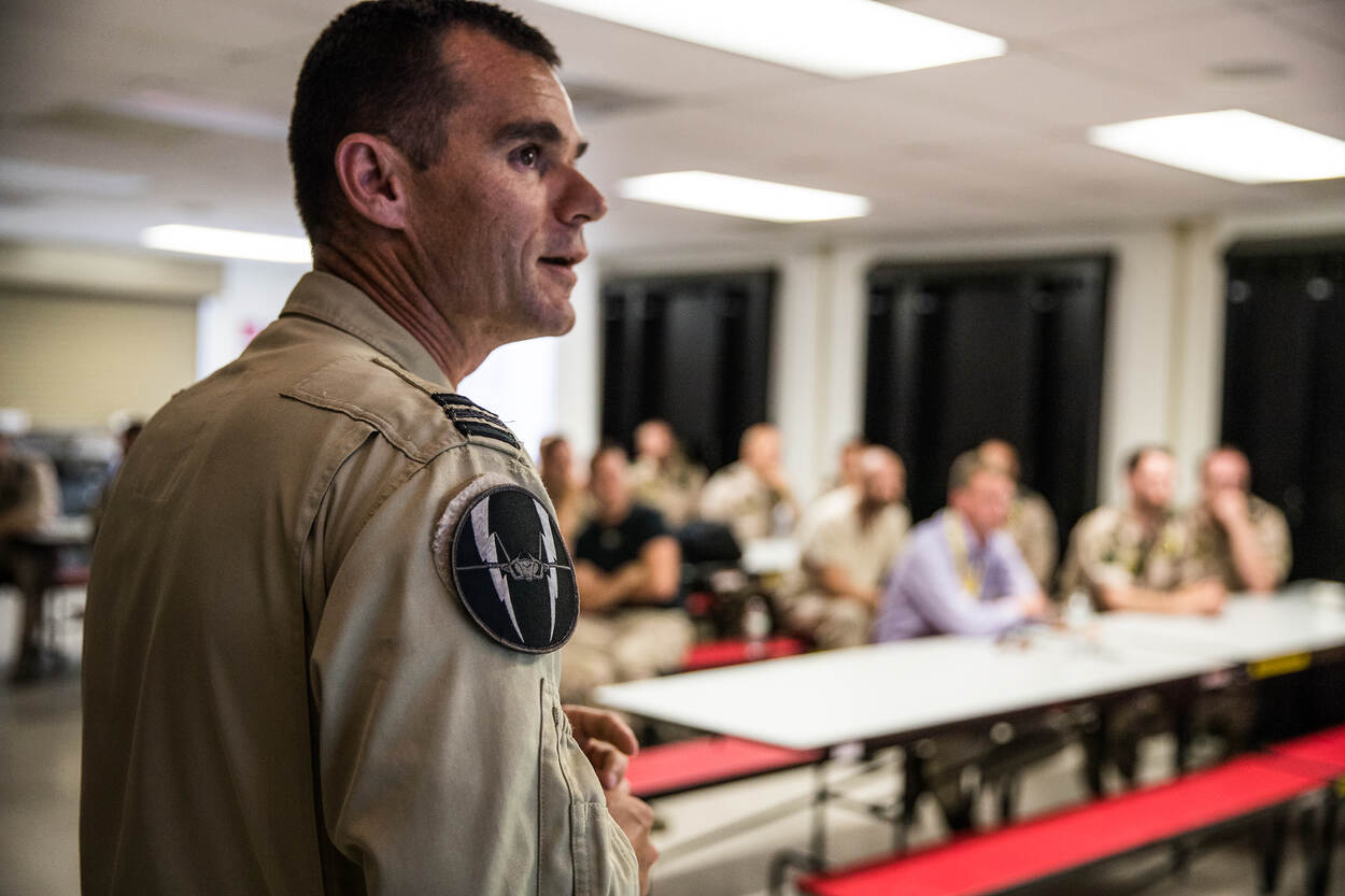 Smaal, op de foto nog bij een briefing op Edwards Air Force Base, kan tevreden zijn: de 2 F-35’s hebben hun bijzondere missie uitgevoerd en staan veilig op het Volkelse beton. Foto: sergeant Jan Dijkstra