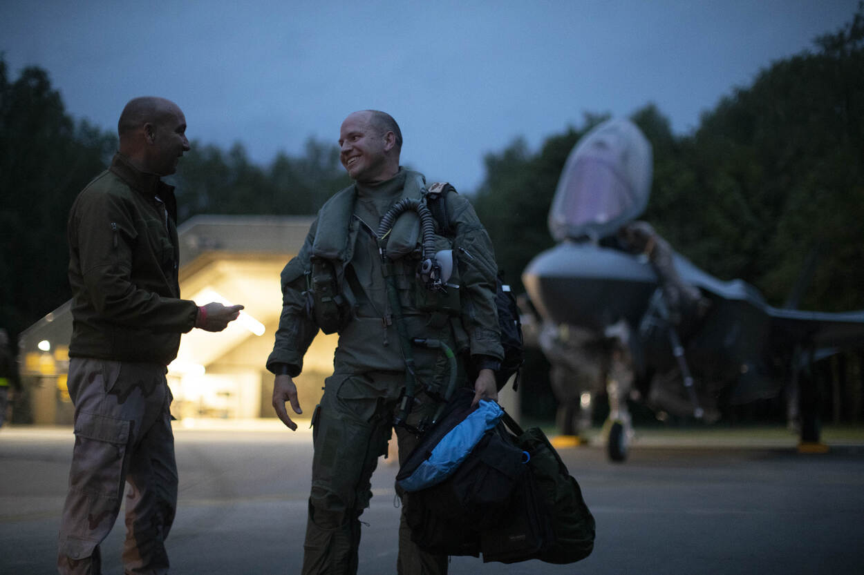 Rond 10 uur ’s avonds naderen in het bijna donker 2 vleermuisachtige silhouetten Vliegbasis Volkel. Rond dit tijdstip kunnen dat alleen nog maar de 2 Nederlandse F-35’s zijn. Foto: sergeant-majoor Hille Hillinga