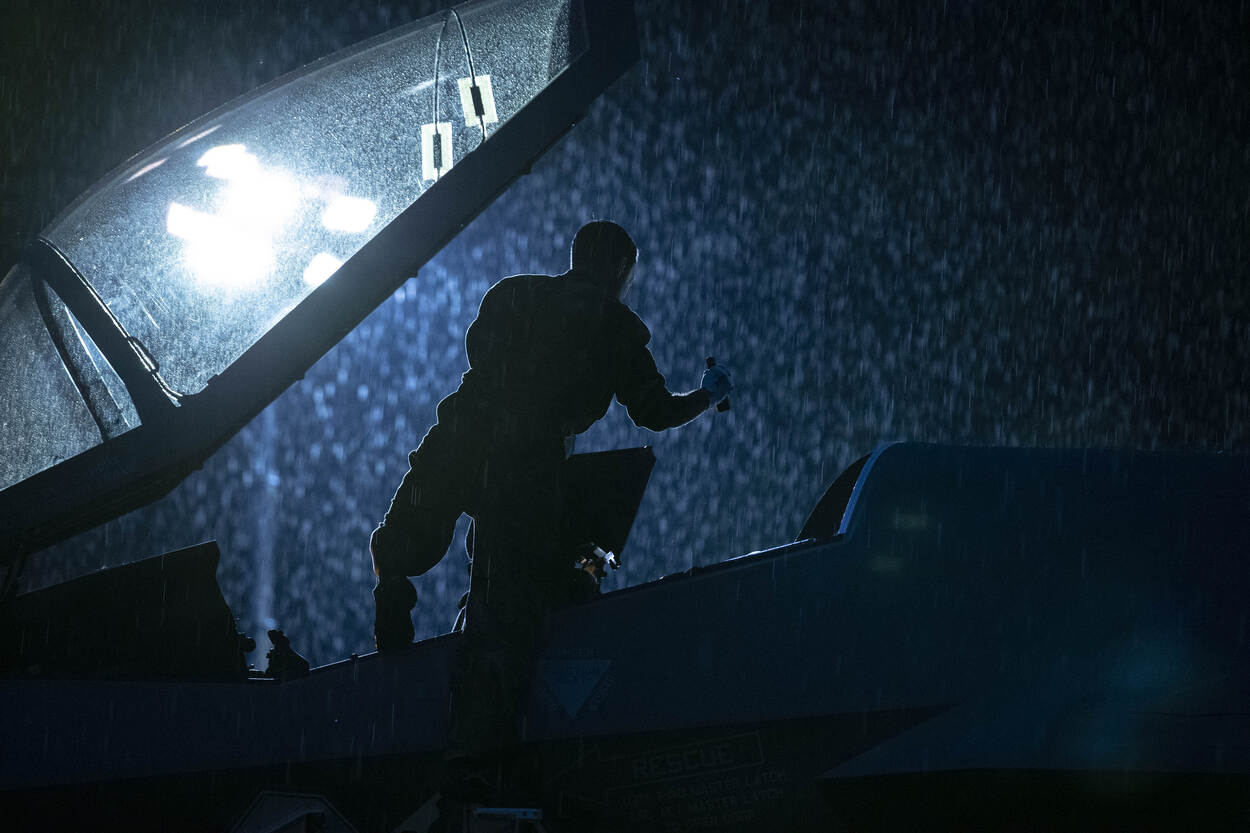 In inmiddels oer-Hollands weer, waarbij de regen met bakken naar beneden komt, taxiën de 2 F-35’s naar de shelters, waar de vliegers tevreden uitstappen. Regen of niet, techneuten staan meteen klaar om de kisten te inspecteren. Foto: sergeant-majoor Hille Hillinga