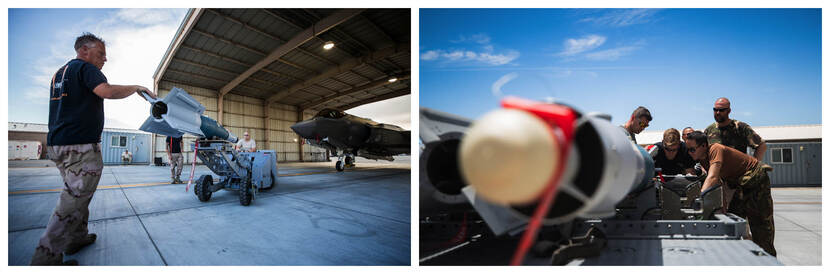 Op Edwards ‘hangen’ bewapeningsspecialisten in beide Nederlandse F-35’s 2 inert’s, met beton gevulde kopieën van echte bommen: 1 GBU-49 met GPS- én lasergeleiding en een lasergeleide GBU-12, beide van 500 pound. Foto’s: sergeant Jan Dijkstra