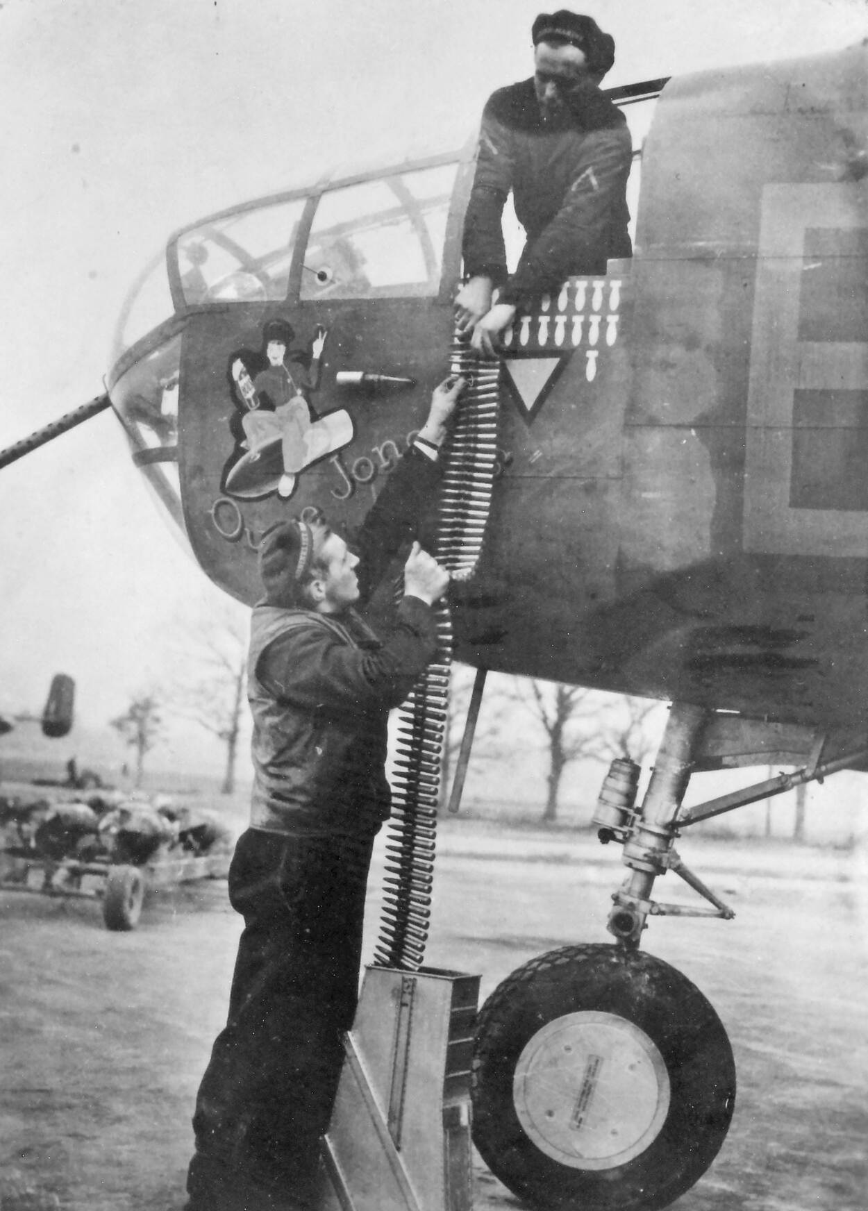 Bewapeningspersoneel brengt munitie aan boord van een B-25 van het 320 Squadron.
