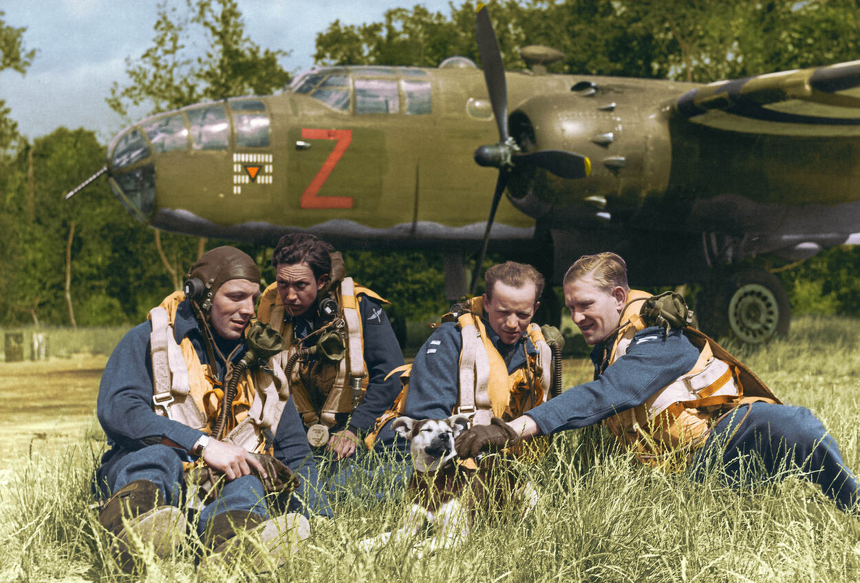 B-25 bemanning van het 320 Squadron (v.l.n.r.) vliegtuigschutter Gilles Almekinders, vliegtuigtelegrafist Johannes Fransen, vlieger Koenraad Vos en waarnemer Joannes de Groot, wachten met hun hondje Skip in juni 1944 op RAF Dunsfold op een nieuwe missie.