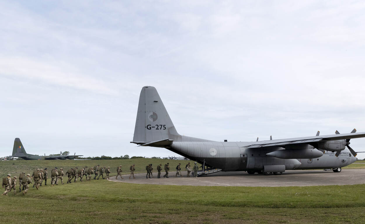De Nederlandse C-130 sluit aan bij de Belgische die is voorzien van invasiestrepen. Foto: Joris van Boven