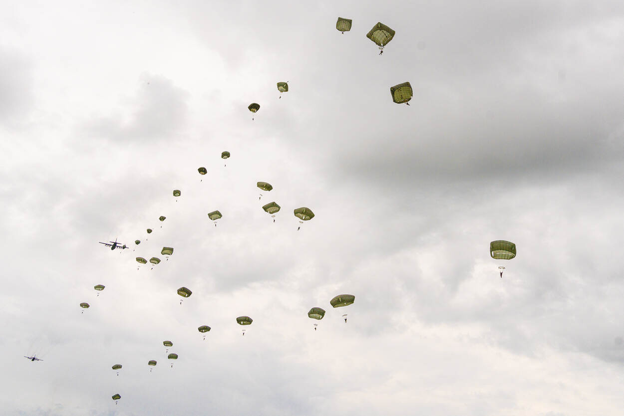 Tientallen parachutisten verlaten C-130’s bij Saint-Mère-Église. In totaal springen er daar liefst 900. Foto: Louis Meulstee