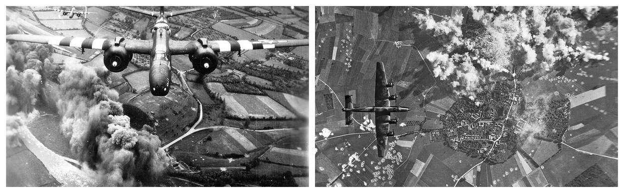 Bombarderen van de verdedigingswerken op de Normandische kust en het achterland is een zeer belangrijke taak voor de militaire luchtvaart. Dat gebeurt onder ander met Amerikaanse A-20 Havoc (foto l.) middelzware en Britse Halifax (foto r.) zware bommenwerpers.
