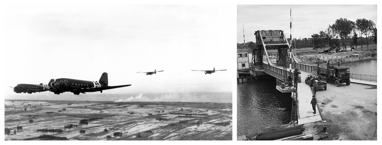 Zo vliegt een deel van de Amerikanen naar Normandië, in C-47’s en Waco gliders (foto l.). Rechts landing van de Britten met Horsa gliders op slechts tientallen meters van de cruciale Pegasus Brug die ze zonder al teveel moeite innemen.