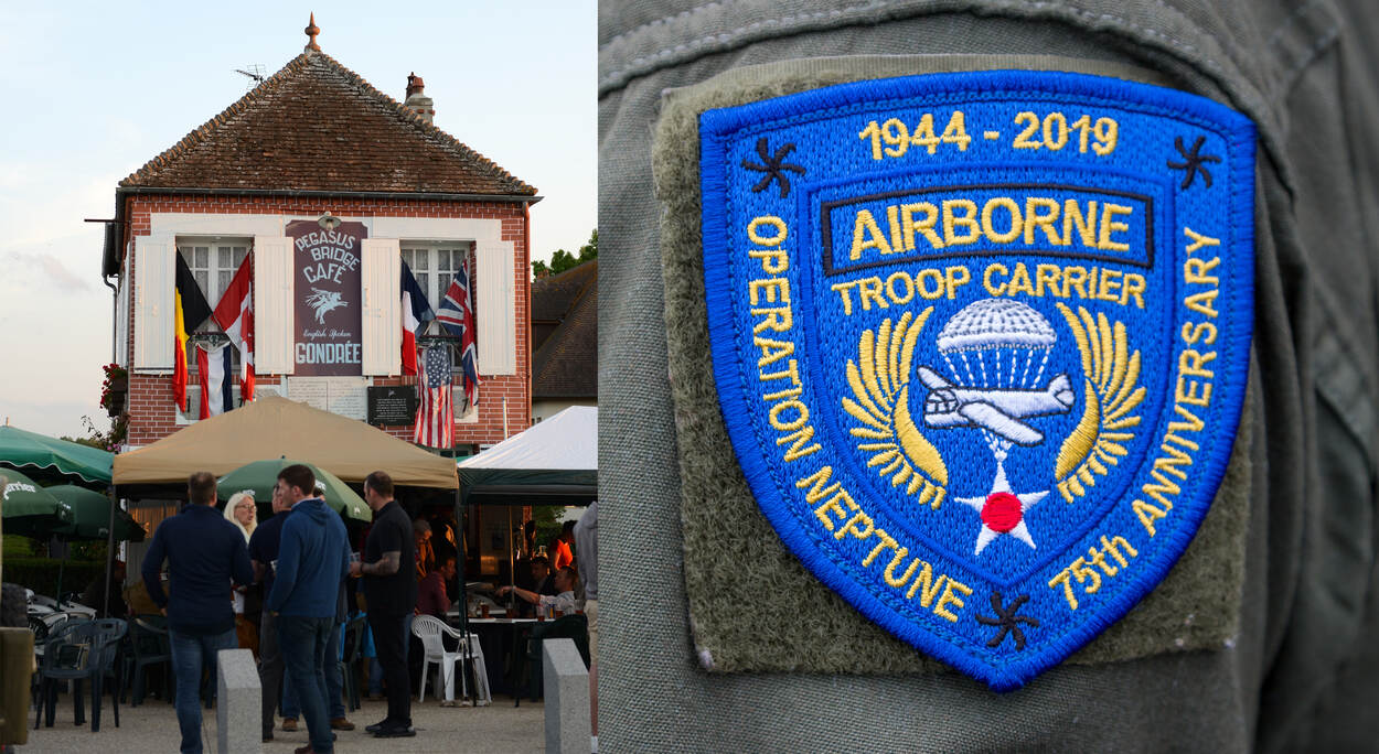 Destijds een onderkomen voor Britse militairen, tegenwoordig een toeristische trekpleister: het Pegasus Brigde Café nabij de Pegasusbrug. Rechts de herdenkingsbadge van de Geallieerde luchtlandingen. Foto’s: Northern Skies Aviation
