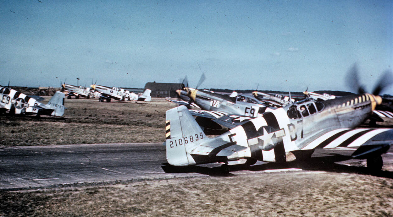 Prachtig voorbeeld van invasiestrepen op Amerikaanse P-51B Mustangs op RAF Bottisham. Vanwege de snelheid waarmee ze moesten worden aangebracht, zaten de strepen er lang niet altijd zo strak op.