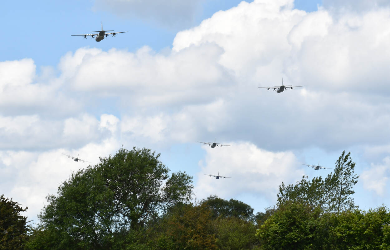Formatie van (zichtbaar) 6 Amerikaanse C-130’s van het 37th Airlift Squadron. De eenheid op Ramstein Air Base in Duitsland nam als 37th Troop Carrier Squadron deel aan D-Day. Foto: Northern Skies Aviation