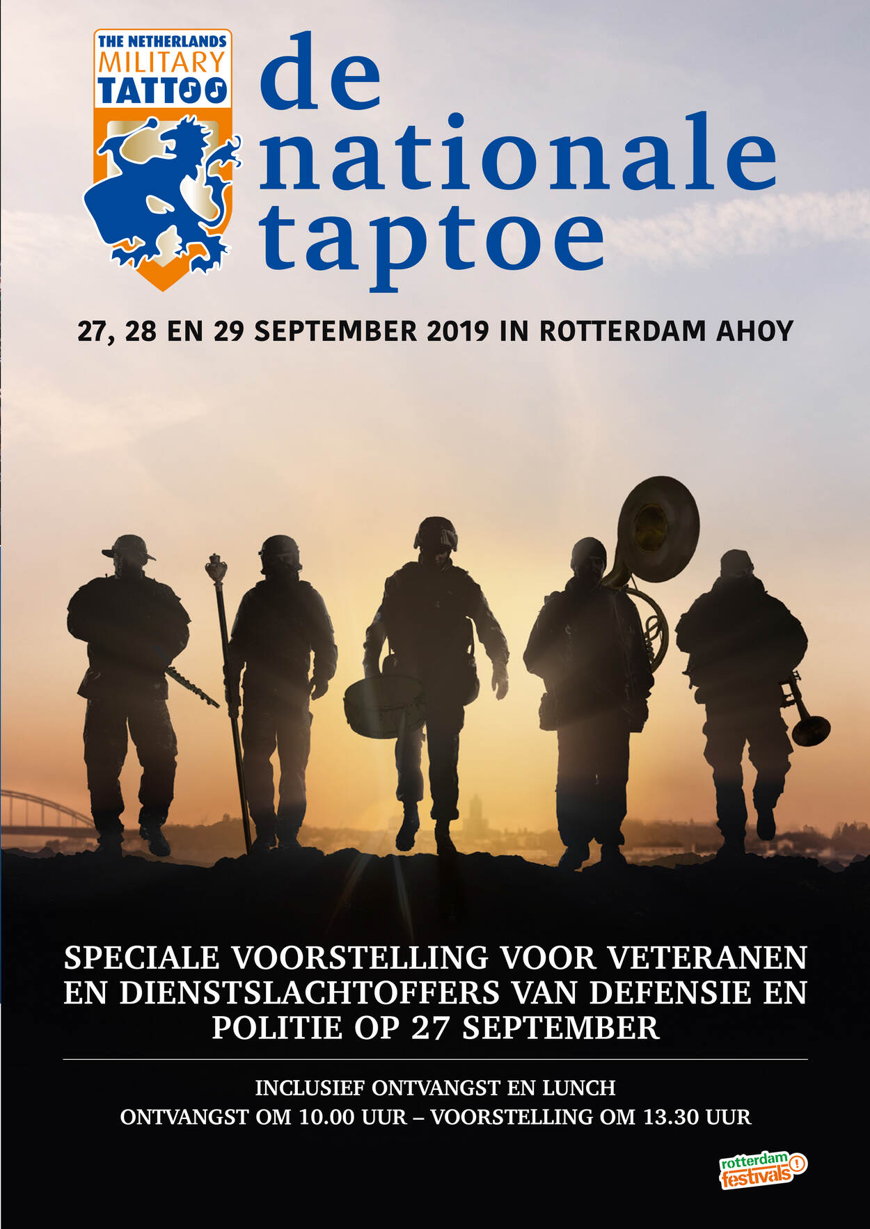 De Nationale Taptoe in Ahoy Rotterdam ontwikkelt zich tot een groot schouwspel waarin historische thema’s theatraal en muzikaal zijn uitgewerkt. Dit jaar vindt het plaats van 27 tot en met 29 september. Orkesten, artiesten en figuranten werken samen in grote scènes waardoor er veel te beleven is. Met entr’acts van onder meer Cesar Zuiderwijk en Jörgen van Rijen.