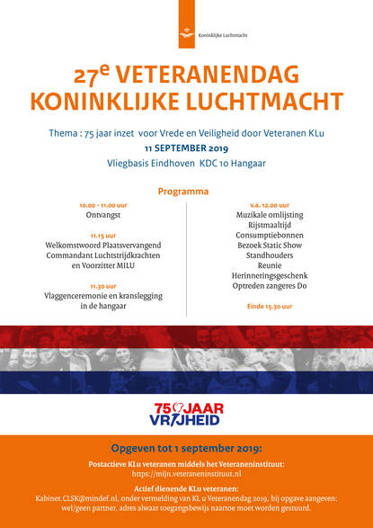Op woensdag 11 september vindt op de Vliegbasis Eindhoven hangaar de traditionele (27e) Veteranendag KLu plaats. Deze 27eeditie heeft als thema “75 jaar inzet voor vrede en veiligheid door veteranen KLu”.
