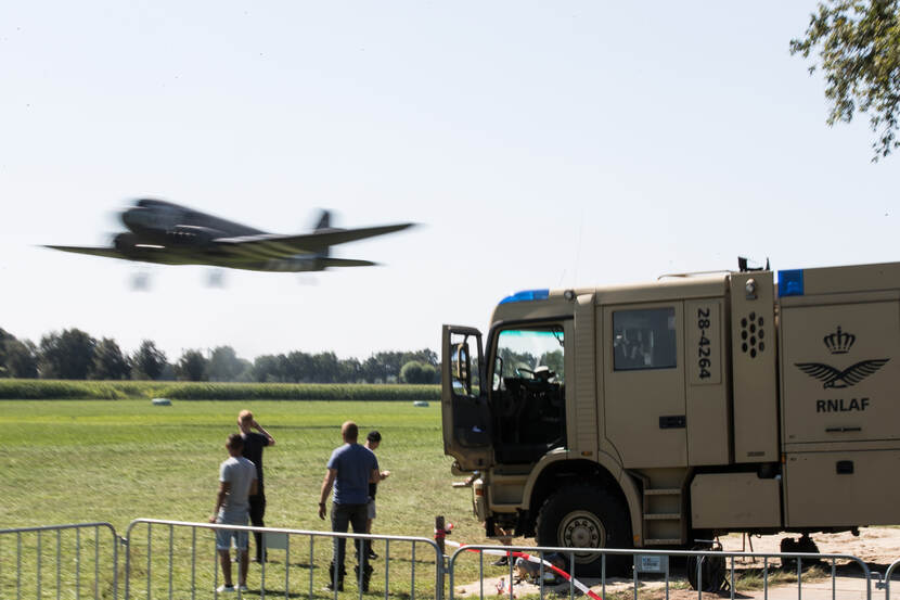 Geen vliegfeest trouwens zonder inbreng van de Koninklijke Luchtmacht. Zo ook in Ede. Voor de veiligheid van het vliegverkeer leverde het Defensie Helikopter Commando (DHC) 3 man van de brandweer van het 931 Squadron en een Mercedes Actros blusvoertuig van Deelen. “We hebben een de HV-uitvoering meegenomen, met een spreider, schaar en ram. Als het moet, kunnen we daarmee hier goed uit de voeten”, geeft sergeant Marcel aan. “Ik heb mezelf hiervoor opgegeven. Hartstikke leuk en de organisatie heeft alles perfect geregeld, van voeding tot overnachting.”