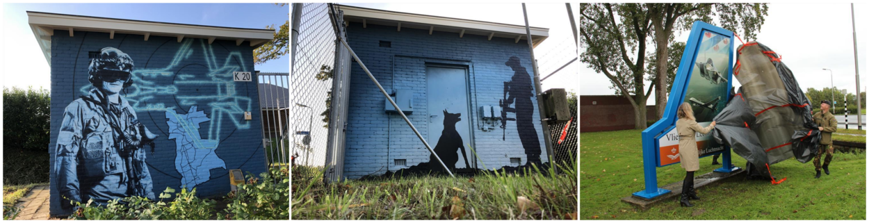 Het gebouw is beschilderd door graffitikunstenaar Roy Schreuder. Op de zijkant van het KMAR-gebouw hangt een grote banner van de F-35. Gina Tromp, accountmanager Economische zaken gemeente Leeuwarden en Hoofd Onderhoud & Logistiek luitenant kolonel Koen Potman onthulden de nieuw beschilderde (F-16) staart bij de entree van de vliegbasis. Daarop hebben sergeanten 1 Dick de Ruiter en Albert Drent van de schilderwerkplaats een ontwerp van tekenaar Peter van Stigt uitgevoerd. Foto’s: KLu