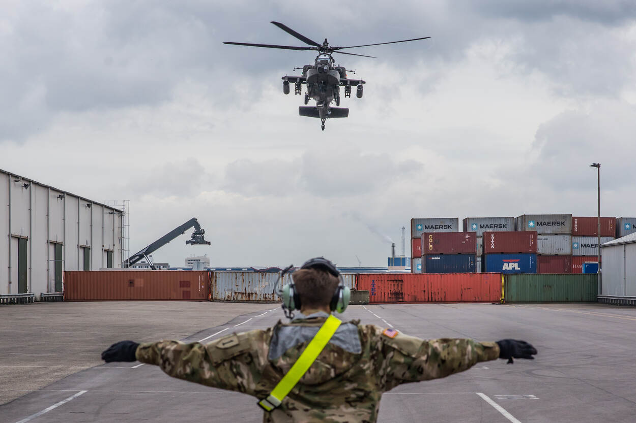 Van de terminal in de Botlek is een zogenoemd Tijdelijk Militair Object gemaakt. Vanuit deze uithoek van Nederland vertrekt een deel van de 1st Infantry Division naar thuisbasis Fort Riley in Kansas. Deze U.S. Army-eenheid beschikt over een eigen helikopterbrigade voor transport en luchtsteun: de 1st Combat Aviation Brigade. Op de helikopters prijkt dan ook het schild met daarin de ‘Big Red One’, het logo van 1st Infantry. “Dit zijn meer helikopters dan de hele Nederlandse luchtmacht heeft’, zegt majoor Michel Poels. Hij leidt de zogeheten Host Nation Support (HSN)-operatie vanuit de Koninklijke Luchtmacht al voor de vierde keer: 3 keer redeployment vanuit Duitsland en 1 keer deployment vanuit de USA. “En we hebben het hier over één enkele Amerikaanse eenheid… van de landmacht ook nog.”