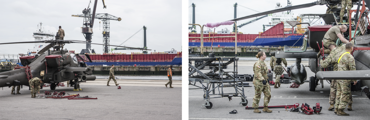 Deze helikopters (50 Black Hawks, 24 Apaches en 12 Chinooks) zijn in februari aangekomen in de haven van Zeebrugge en daarvandaan naar Duitsland gevlogen.