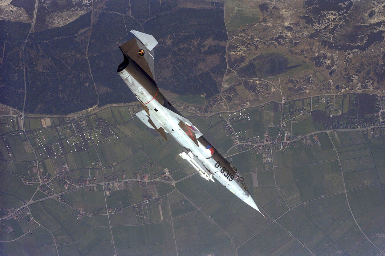 Prachtige opname van een 104 van het 323 Squadron. Nederland koopt 77 F-104G’s en 18 RF-104G’s die door Fokker worden gebouwd. Via het Mutual Defense Assistance Program ontvangt de luchtmacht nog 25 toestellen (in de 6000-serie) die door Fiat worden gebouwd. Lockheed bouwt zelf 18 TF-104G's tweezitters voor de KLu.
