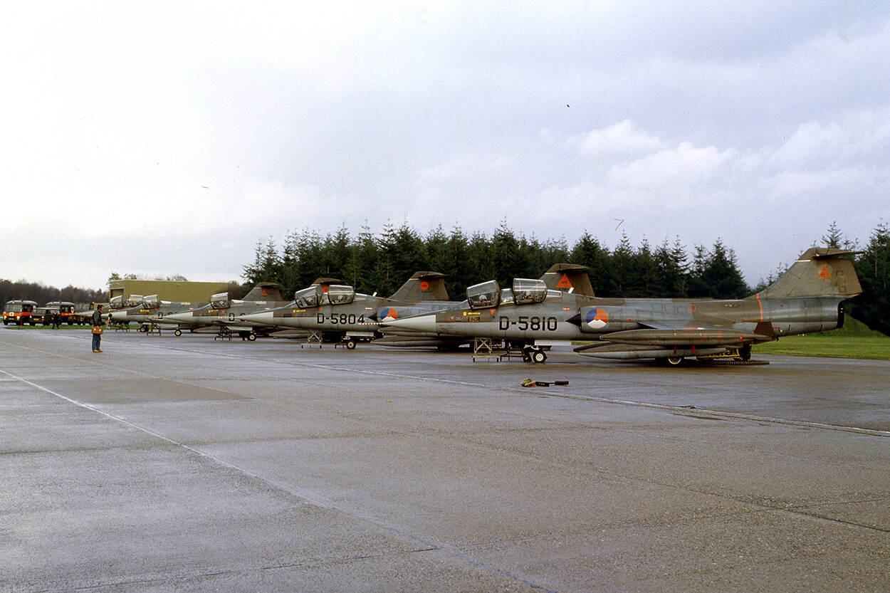 De 5 laatste Starfighters van het Uitfaserings Onderdeel (UFO) staan op 21 november 1984 klaar op de Vliegbasis Volkel, 35 jaar geleden. Ze maken vergezeld door 2 F-16’s een afscheidsvlucht over alle Nederlandse vliegbases en ranges.