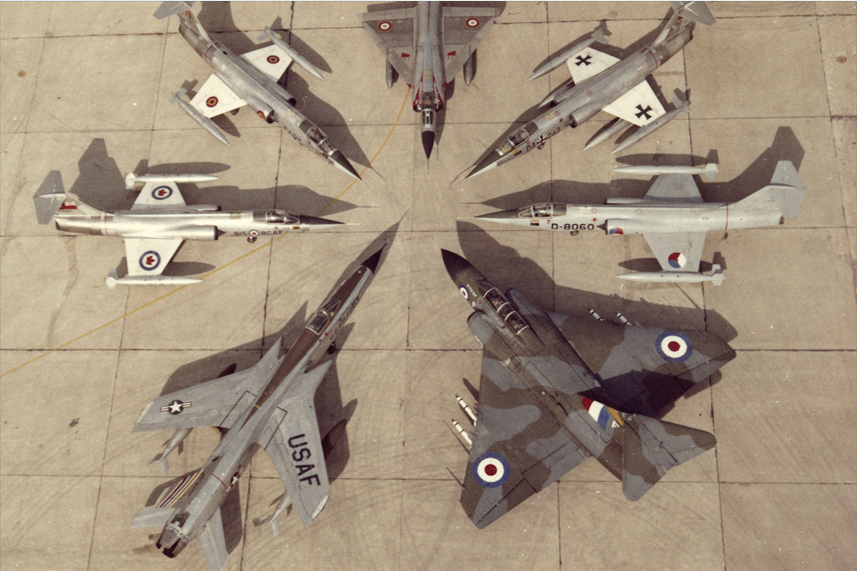 NAVO-plaatje uit de jaren ’60: Starfighters uit België, Canada, Duitsland en Nederland (eerst nog nevelgrijs, later gecamoufleerd) en een F-105D van de USAF, Mirage III van de Armee de l’Air en Gloster Javelin van de RAF.