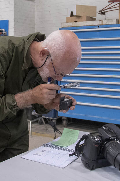 Theo Rombout bezig met zijn oude en nieuwe werk: fotograferen en in het kaart brengen van alle onderdelen.