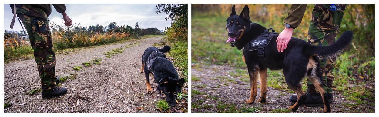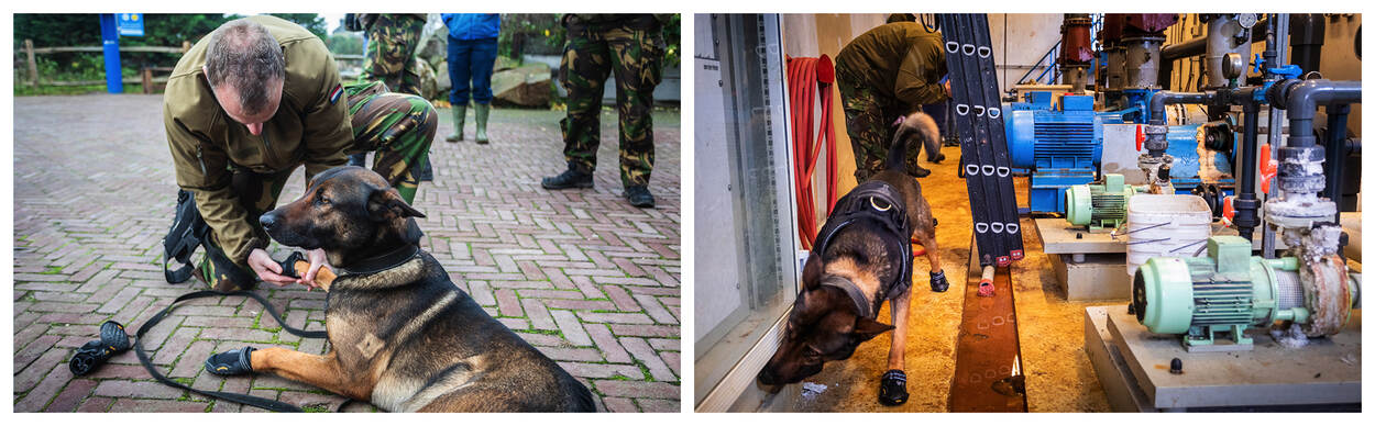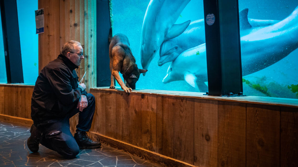 Niets is voor een explosievenspeurhond boeiender dan snuffelen aan het zeeleven in Dolfinarium Harderwijk. De prikkels die dat oplevert, laat zelfs de doorgewinterde kwispelaar niet onberoerd. “De mogelijkheden voor afleiding zijn hier legio”, begint oefenleider sergeant-majoor Jan-Willem Jonk. “Hond en geleider schotelen we verrassingen voor waar beiden zich overheen moeten zetten.”