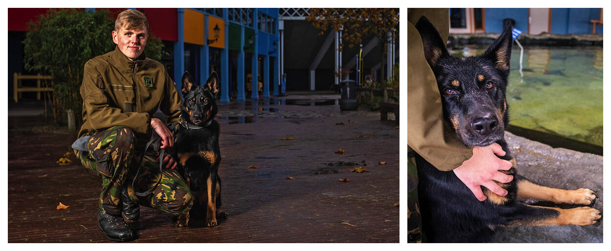 Korporaal 1 Jasper met Lady, een mooie, nieuwsgierige Duitse herder. Lady is een overwatch search dog. Ze is inmiddels 4, maar volgens Jasper nog altijd een puppy. “Met deze hond verveel je je nooit.”