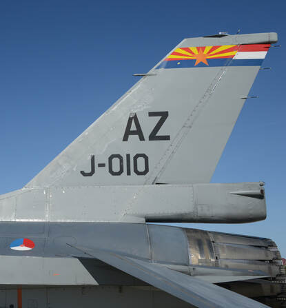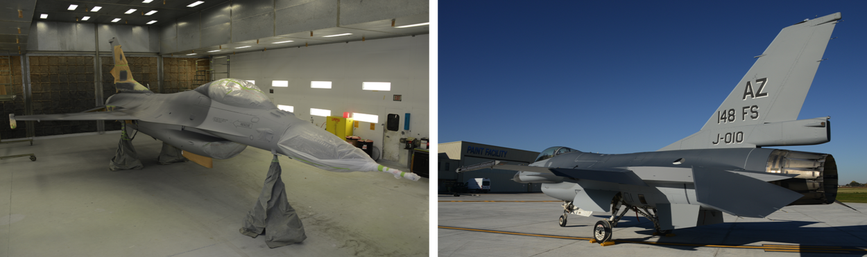 Een KLu F-16 van het 148th Fighter Squadron op Tucson International Airport is eind oktober voor een broodnodige schilderbeurt overgevlogen naar de staat Iowa. De spuiters van de lokale Air National Guard paint facility in Sioux City klaarden deze voor hen ook bijzondere klus. De kleuren van de Nederlandse F-16 hebben namelijk een net iets anders verloop dan de Amerikaanse.