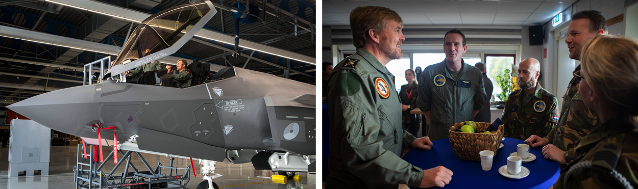 De koning onderging strenge veiligheidsmaatregelen om het nieuwe werkgebied van de F-35 binnen te komen. Daar mocht hij zijn eerste vlieguren op de F-35 simulator te maken. In de hangaar bezocht de koning de eerste F-35 die op 31 oktober op Vliegbasis Leeuwarden landde. De F-35, maar ook de komst van de MQ-9 volgend jaar, leggen het fundament voor een 5e generatie luchtmacht. Het personeel is al volop bezig met opleiding, ontwikkeling, kennisvergaring en ervaringsopbouw op het op afstandbestuurde systeem, waarover de koning uitgebreid werd geïnformeerd in de PED-Cel. Dit is de ruimte van waaruit analyses worden gemaakt op basis van videobeelden van onbemande vliegtuigen en verwerkt tot inlichtingenproducten voor de opdrachtgever. Het bezoek werd afgesloten met een gesprek met personeel van de nieuwe wapensystemen. Foto’s: sergeant-majoor Gerben van Es