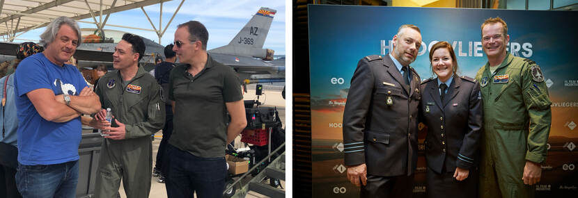 Foto l.: Nayci (r.) in gesprek op de set op Tucson. Foto r.: Plankman (l.) deed het regelwerk binnen de luchtmachtstaf. Luijsterburg (r.) was de man van de luchtopnames. Kapitein Suzanne de Boer-Mateijsen (m.) regelde alles rondom de opnames en de begeleiding.