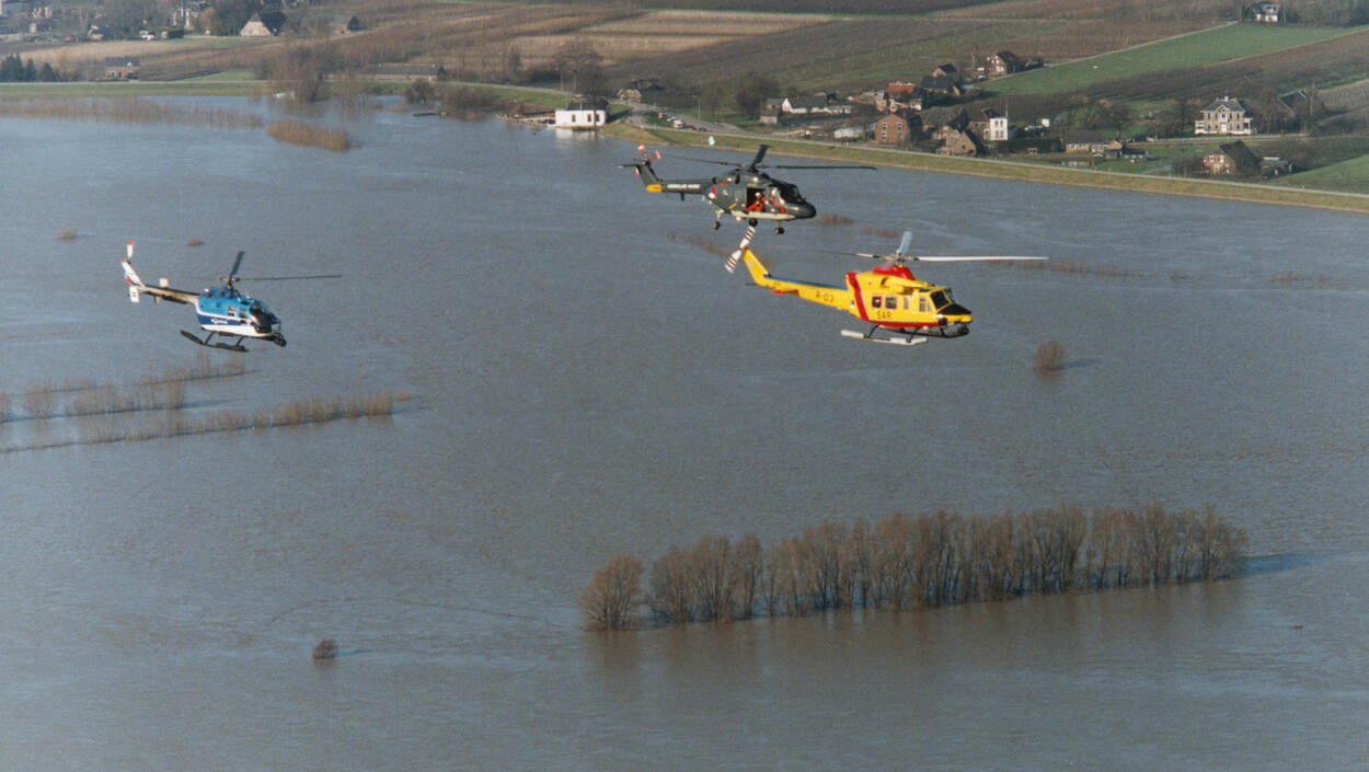 De 2 reddingsdiensten van Defensie en de observatieheli van de politie die in 1995 vanuit de lucht de helpende hand toestaken, in formatie boven de buiten zijn oever getreden de Maas.