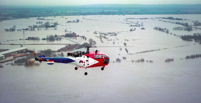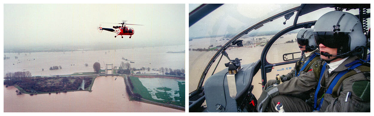 Het is niet dat Nederland geen waarschuwing krijgt, want al op 20 december 1993 zoekt het water zijn weg buiten de oevers van de Maas. Kapitein Mariëlle Winnubst-Benda, tegenwoordig Hoofd Simulator van het 300 Squadron, krijgt tijdens haar kerstverlof op 23 december het verzoek of ze de volgende dag kan vliegen. “Natuurlijk!”, reageert de eerste luitenant Alouette-vliegster van destijds. “’s Morgens vroeg vertrok ik samen met een techneut vanaf Soesterberg naar de brandweerkazerne in Venlo waar een commandopost was ingericht. Die dag vloog ik – vanaf de sportvelden – diverse missies. Ik was als eerste ter plaatste om vanuit de lucht polshoogte te nemen. Op de A2, onder andere bij Den Bosch, kwam het water bijna tot aan de borden boven de weg. Het was een vreemde gewaarwording om boven een schijnbaar levenloos landschap te vliegen.” In 5 dagen worden 12.000 mensen geëvacueerd.