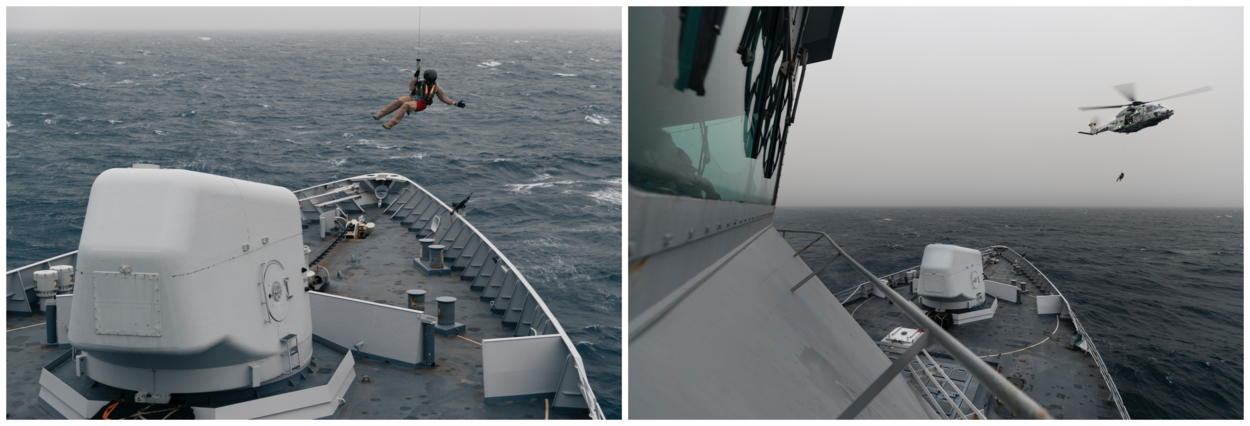 De mannen van de NH90 hoeven zich niet te vervelen aan boord van Zr.Ms. De Ruyter. Vlieger luitenant ter zee 2OC Christiaan, tactical coördinator luitenant ter zee 2OC Wouter, sensor operator sergeant Dave en rescue operator marinier 1 Robbert vliegen bijna dagelijks. Hun eerste doel: patronen herkennen. Oftewel, een beeld schetsen van wat in dit gebied normaal is. Wouter: “Als we dat weten, kunnen we makkelijker zien wat juist niet normaal is; afwijkt. Met die informatie kan de inlichtingen-cell aan boord aan de slag.”