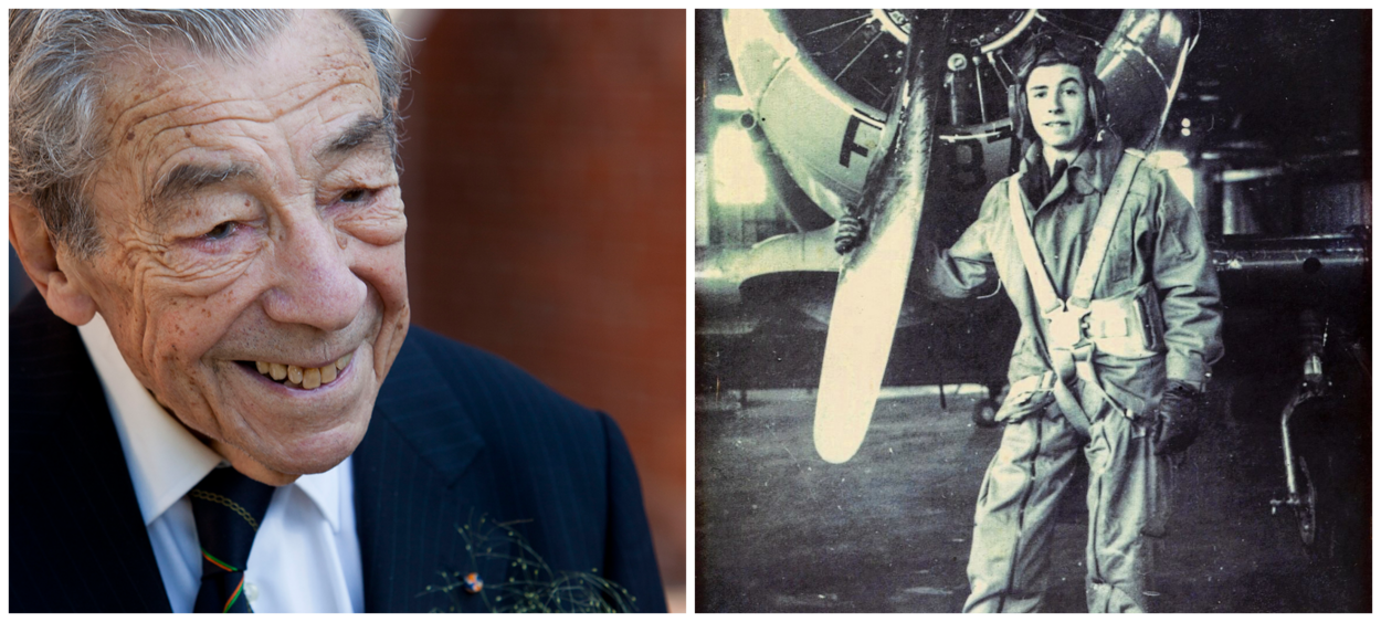Foto links: Eddy Jonker dik 5 jaar geleden op een reünie van het Genootschap Engelandvaarders op landgoed De Zwaluwenberg in Hilversum. Foto: sergeant-majoor Maartje Roos. Foto rechts: Eddy Jonker bij een Harvard na het behalen van zijn wings bij de No.13 Service Flying Training School van de Royal Canadian Air Force in North Battleford, Saskatchewan, Canada.