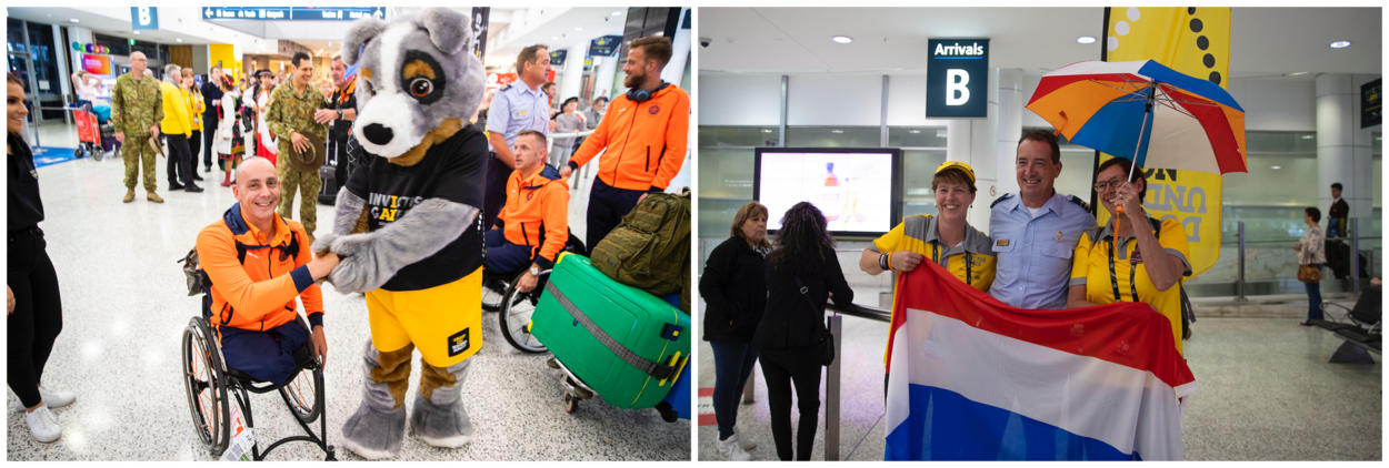 Australië was in 2018 het decor van de Invictus Games. De atleten en de staf werden op het vliegveld verwelkomd door onder andere Hermans (midden) en zijn partner Simone Steendijk (rechts). Foto’s: sergeant Jasper Verolme.