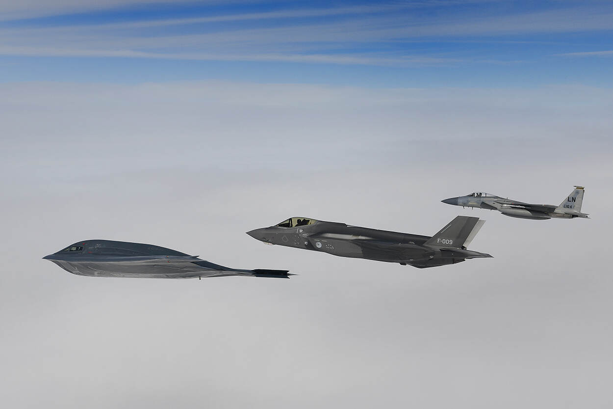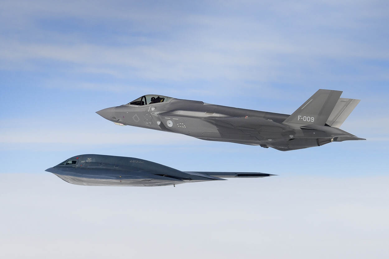 Een Nederlandse F-35A van Vliegbasis Leeuwarden vloog op 18 maart een missie boven de Noordzee met onder meer Amerikaanse B-2A Spirit strategische bommenwerpers en F-15C Eagles, ter ondersteuning van de Bomber Task Force Europe 20-2 van de Amerikanen. De bommenwerpers van de 509th Bomb Wing van Whiteman Air Force Base in de staat Missouri zijn hiervoor te gast op de Amerikaanse luchtmachtbasis RAF Fairford in Engeland. De F-15’s van de 48th Fighter Wing operen vanaf hun thuisbasis RAF Lakenheath, eveneens in Engeland. De Amerikaanse bommenwerpers en jagers vlogen 2 dagen eerder ook al missies met Noorse F-35’s. Foto’s: Master sergeant Matthew Plew, U.S. Air Force.