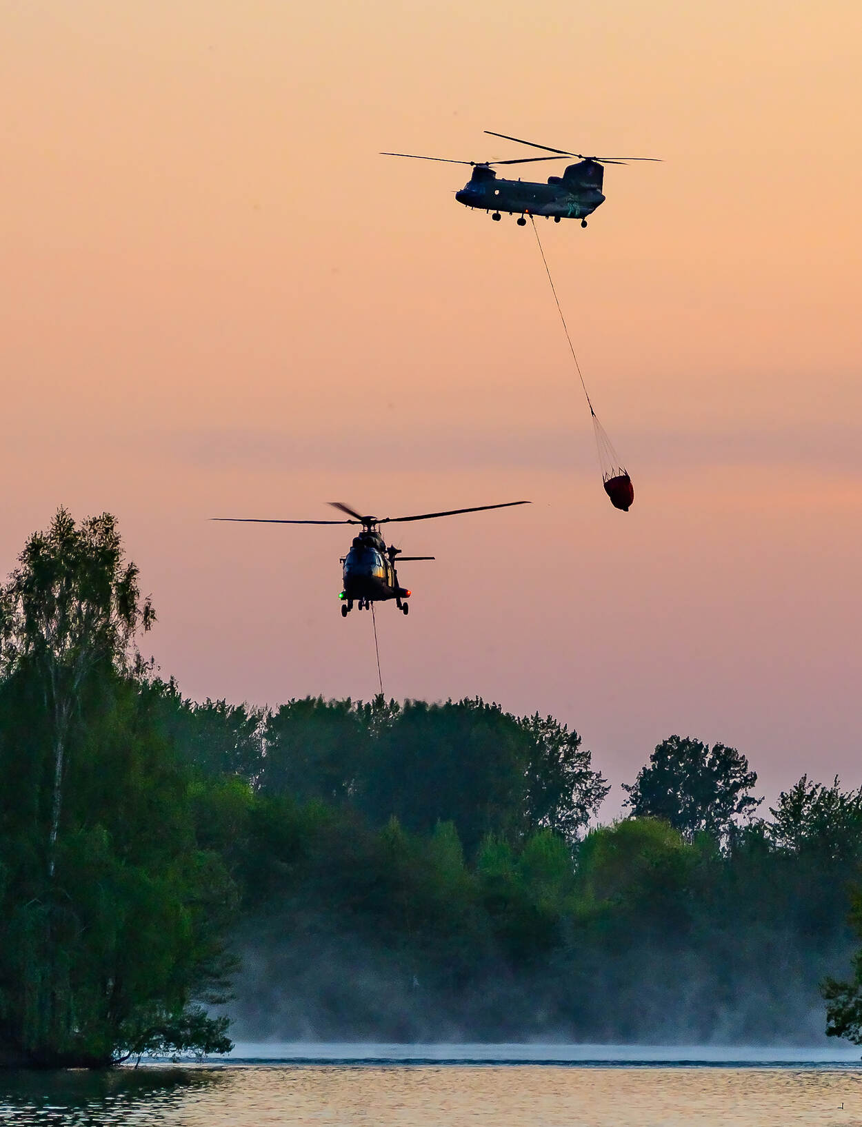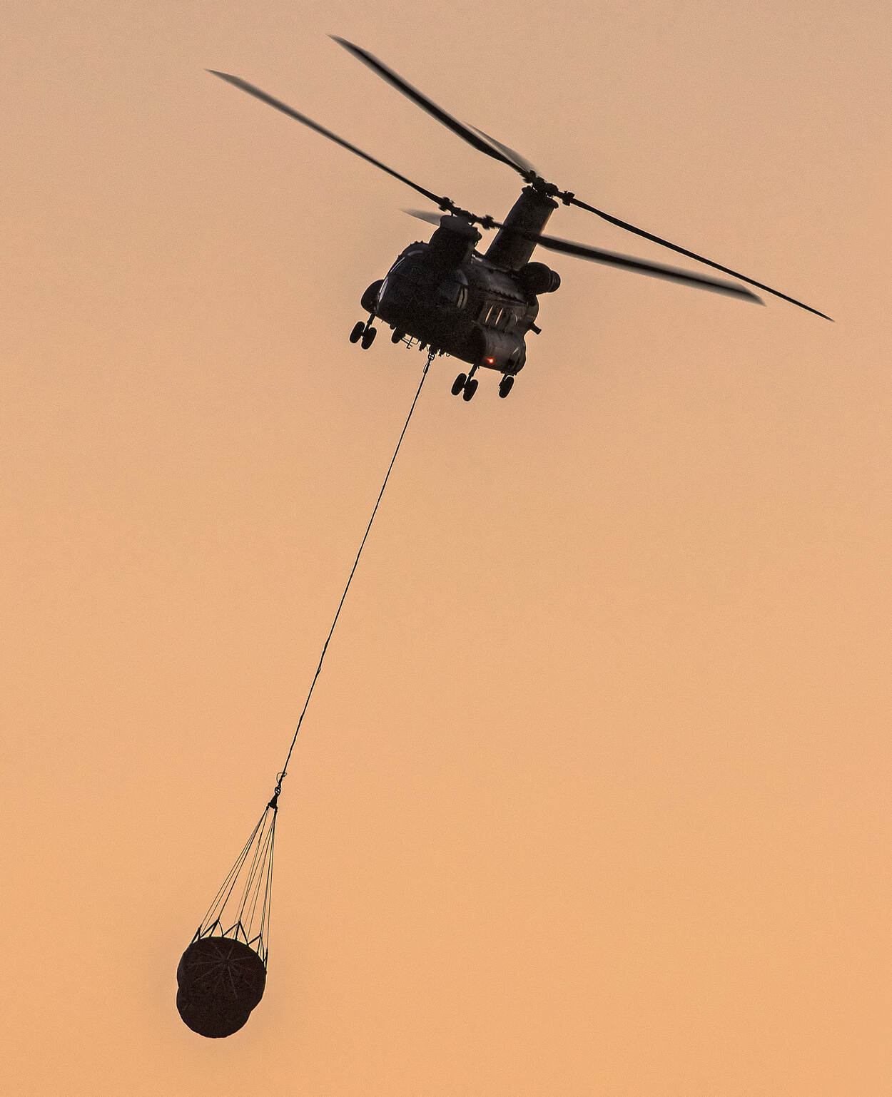 Zwaar beladen hangt de Chinook met een paar minuten boven de brand. Dambacher: “Door de hitte is het best onstuimig in de lucht en vanwege de rook kan je niet vanuit alle kanten aanvliegen. Ook zie je als vlieger de brand niet als je blust, alleen de loadmaster. Die ligt op z’n buik en kijkt door het luik naar beneden.