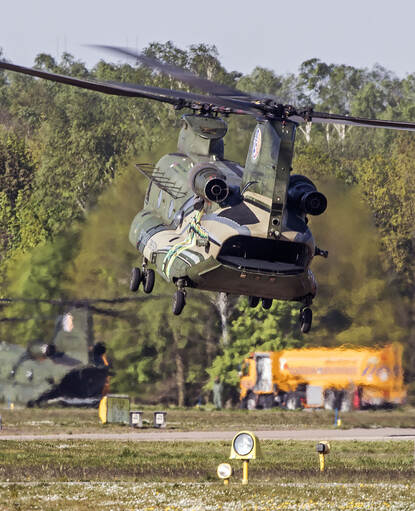 Ervaren Chinook-gezagvoerder kapitein Peter Dambacher van 298 Squadron, heeft als flight lead naar eigen zeggen ‘best wel wat ervaring’. “Maar ik heb zelf nooit eerder een inzet met meer dan met 2 Chinooks gezien. FBO klinkt heftig, maar is voor ons gewoon vliegen met een externe lading. Alle bemanningen zijn ervoor getraind. Maar je merkt het wel als er 8.000 liter onder je hangt. Dat is de hoeveelheid die we meestal meenemen.” Waterscheppen luistert best nauw door de downwash van de Chinook. “Doe je het niet goed, komt de bucket niet onder water. Daarna til je de volle bucket met maximaal vermogen uit het water.”