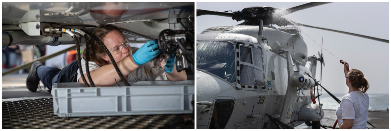 Het zoute zeewater en het warme klimaat vergen veel van de NH90. Jarno: “Regelmatig oefent de vliegcrew het hoisten; een drenkeling uit het water takelen. Dan hangt de heli laag boven water. Als je daarna je vinger erlangs haalt, zit die onder het zout. Dat gaat overal in- en tussen zitten. Na meerdere malen afspoelen, wassen we 'm met zeep.”
