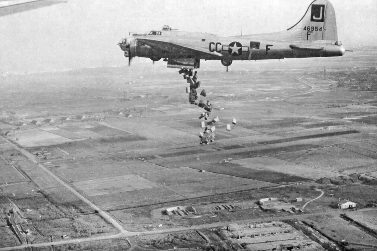 Voor pamfletbombardementen worden bij de Britten en Amerikanen zelfs speciale squadrons opgericht en krijgen sommige vliegtuigen zoals deze B-17 een zwarte kleur. Van 3 september 1939 tot en met 7 mei 1945 verspreiden de geallieerden alleen al vanuit Engeland 598 miljard pamfletten over Europa, ruim 7.000 ton papier.