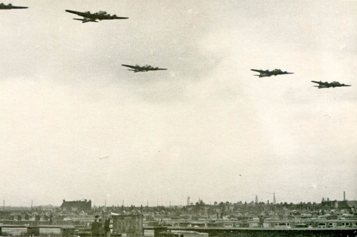 Links het origineel van deze bekende foto van een RAF Lancaster, zónder later toegevoegde vallende voedselpakketten. Rechts: Een formatie B-17’s boven Delft op weg naar Ypenburg.