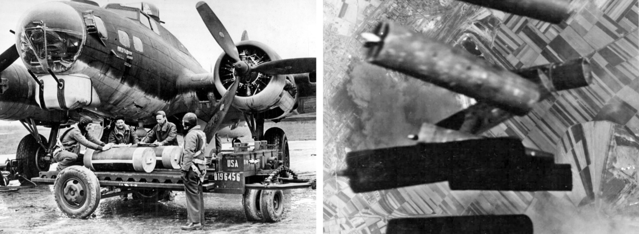 Het laden in een Amerikaanse B-17 en droppen van kartonnen T-1 ‘Monroe’-bommen voor een pamflettenregen over bezet Europa.