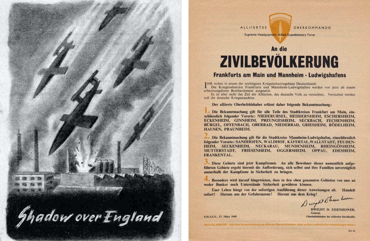 Voorbeelden van luchtpamfletten van Duitsland (l.) en de Geallieerden (r.). Bezit van pamfletten werd door de Duitsers overigens zwaar gestraft met gevangenisstraf van 5 tot 15 jaar.