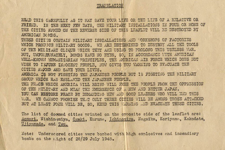 Een zogenoemd ‘Le May’-pamflet, vernoemd naar de Amerikaanse generaal. In het begin waren Geallieerde pamfletten niet effectief, omdat makers niet het juiste Japanse dialect beheersten. Na inzet van gevangengenomen Japanners, verbeterde dat.