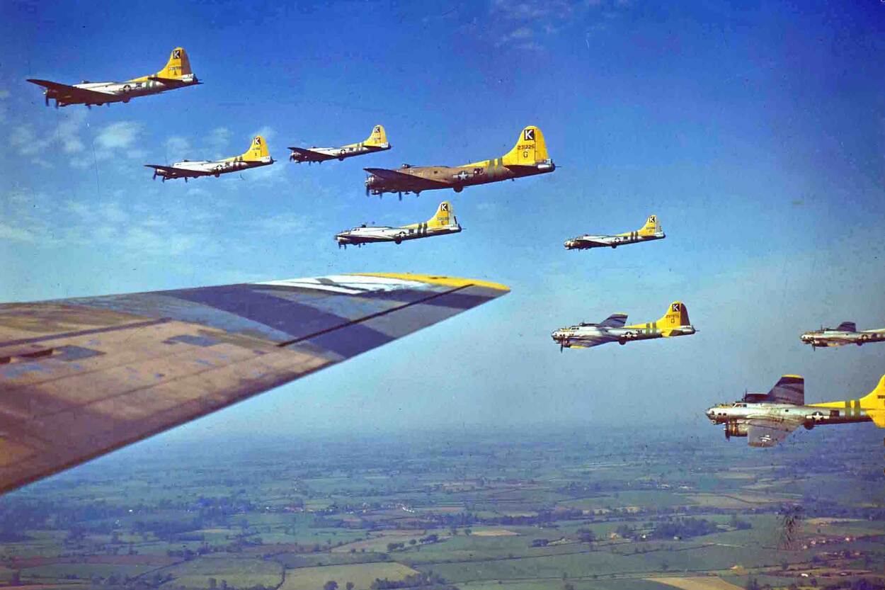 Een B-17G boven vliegveld Valkenburg op 1 mei 1945. Ondanks het staakt het vuren wordt toch 1 Amerikaans ‘Flying Fortress’ geraakt. Het toestel stort neer in Het Kanaal en 10 van 13 inzittenden komen om.