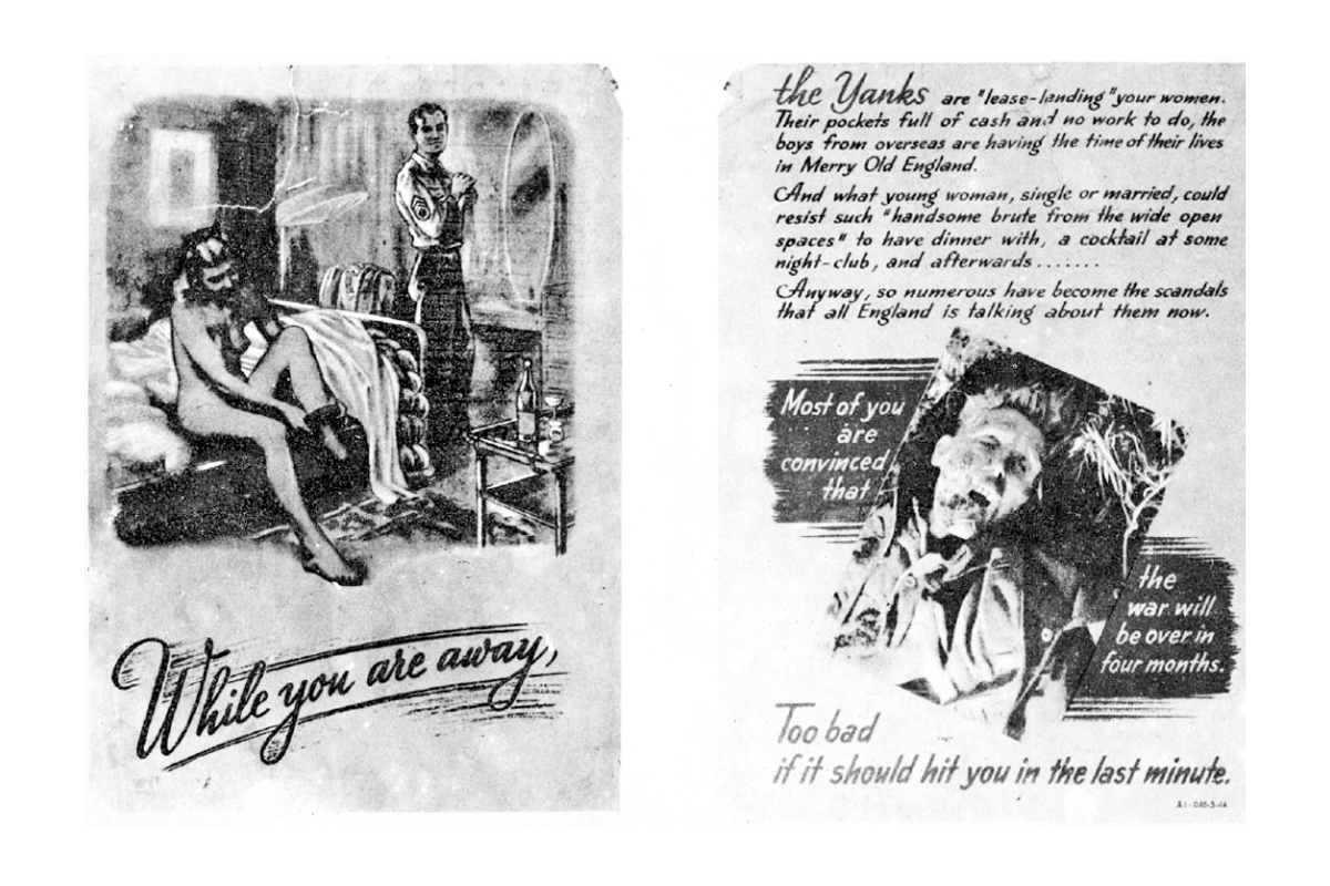 Propaganda is lang niet altijd subtiel, zoals hier een Duitse variant die Britse militairen waarschuwt voor de ‘Yanks’ in Engeland en dood aan het front.